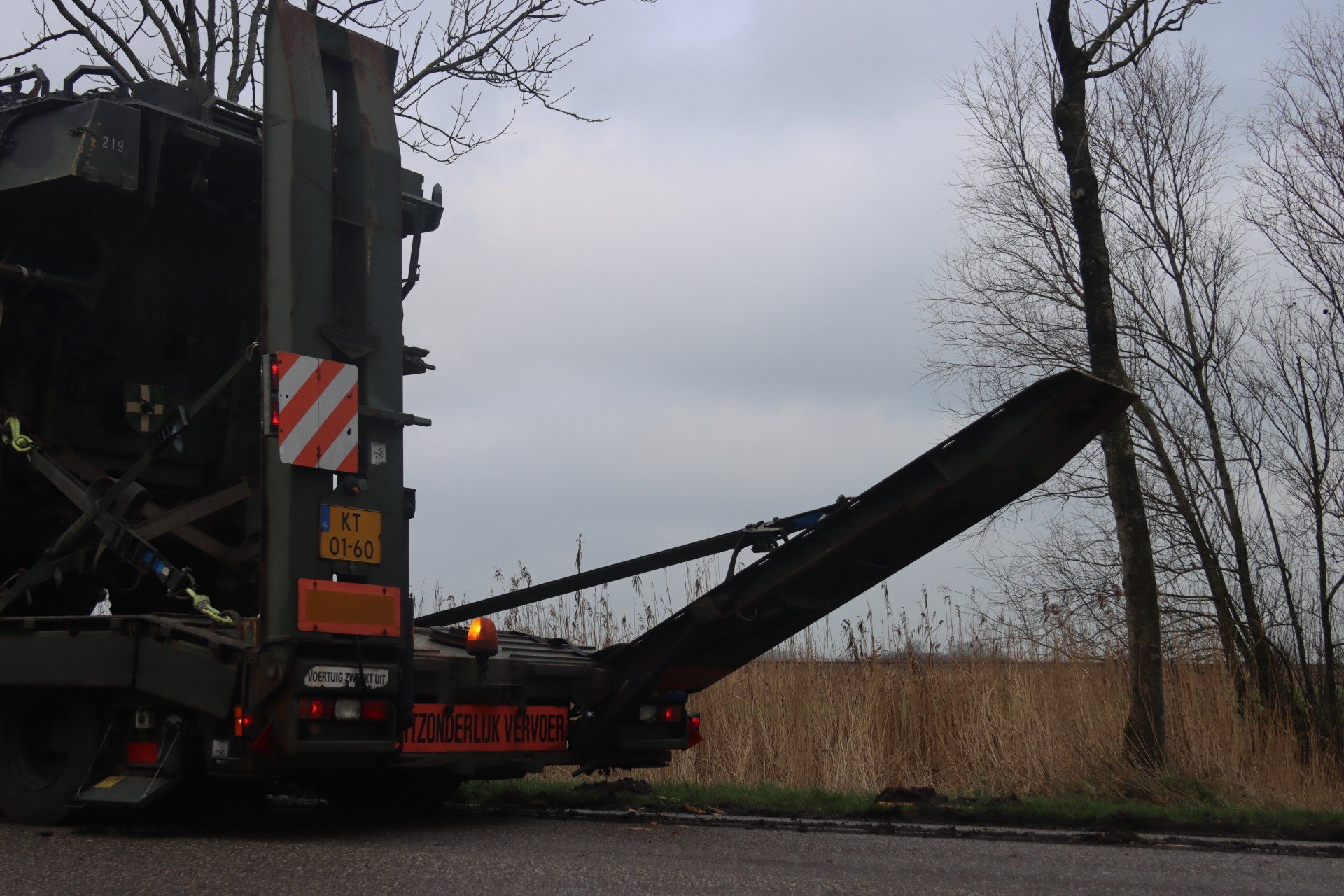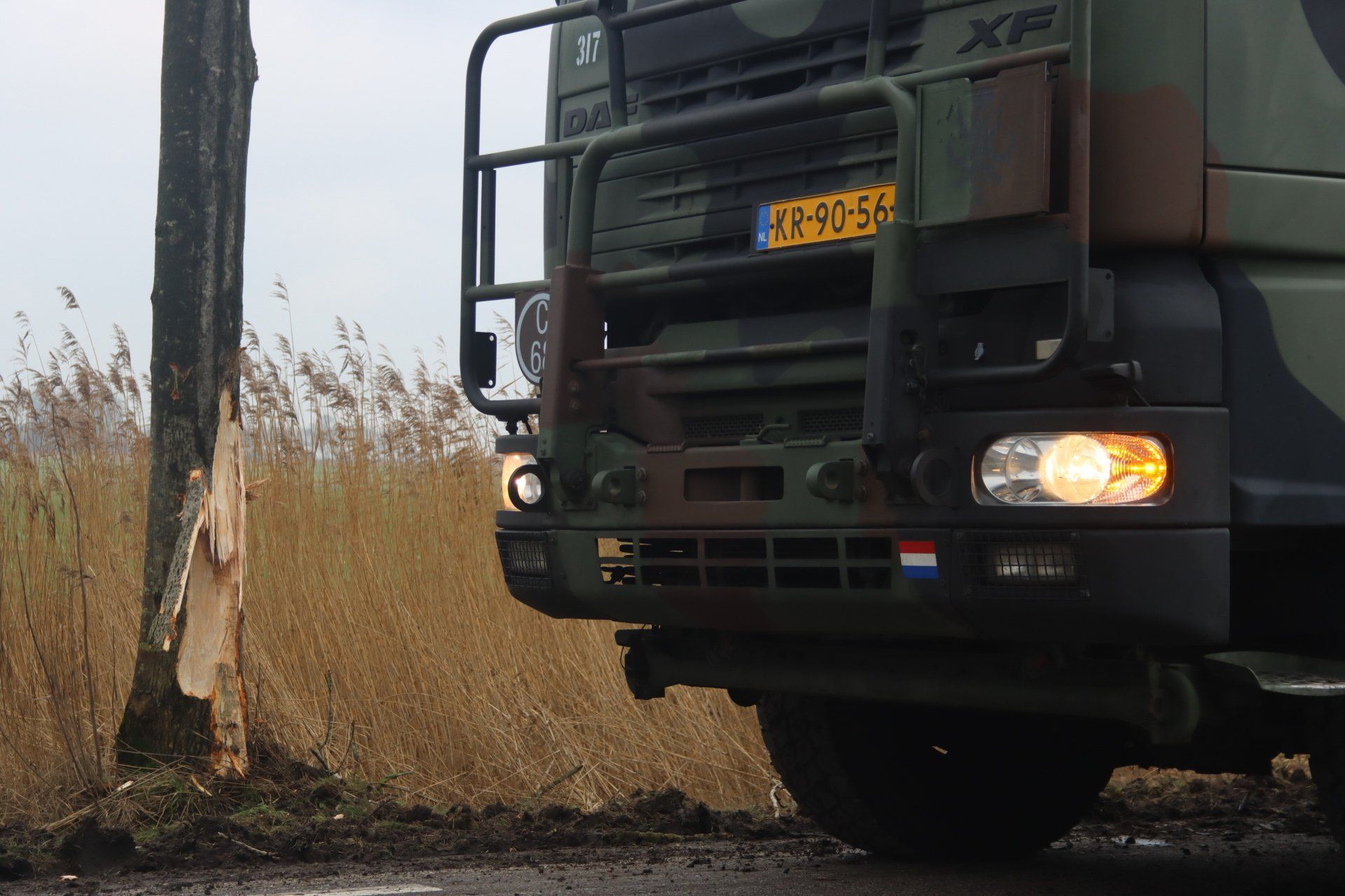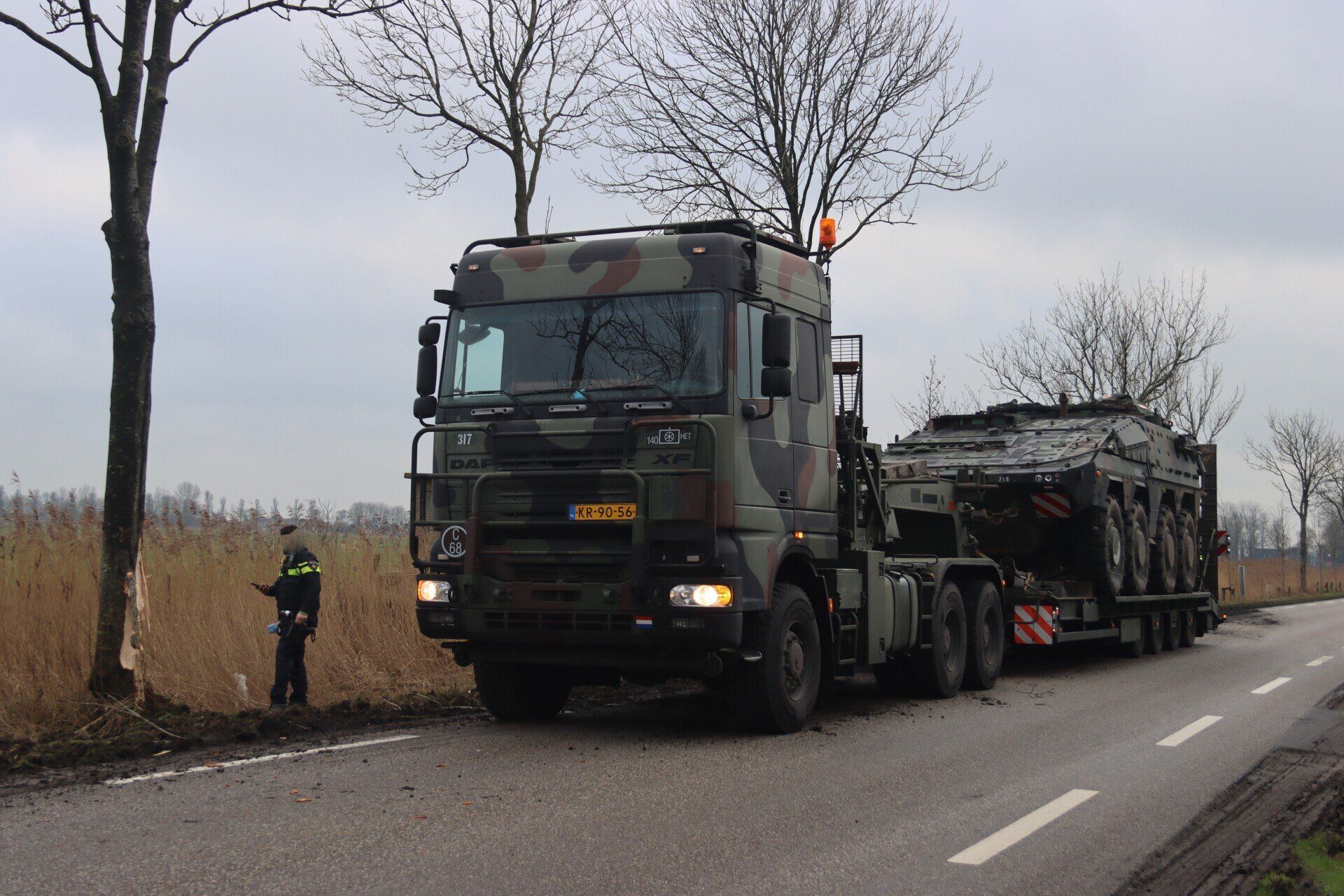 De chauffeur kwam gelukkig met de schrik vrij. De oplegger moet op een andere manier vervoerd worden. De kus met de boom leidde ertoe dat een hydraulisch systeem defect raakte. Daardoor is het niet veilig om zelf door te rijden. De politie maakte een registratie van het ongeval. Het verkeer ter plaatse werd door de aanwezige defensiemedewerkers begeleid.
