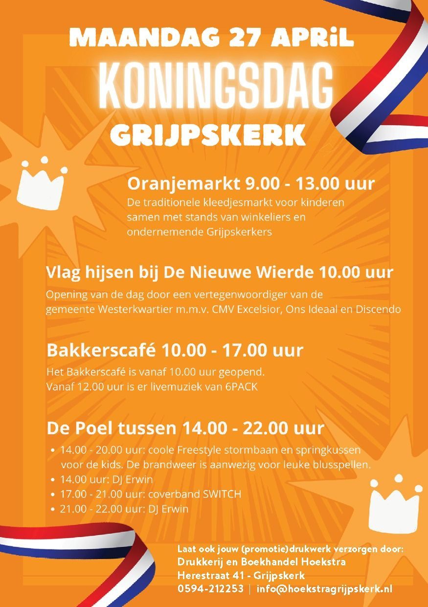 Op maandag 27 april staat Grijpskerk volledig in het teken van Koningsdag. Met een uitgebreid en gevarieerd programma belooft het een feestelijke dag te worden voor zowel kinderen als volwassenen.