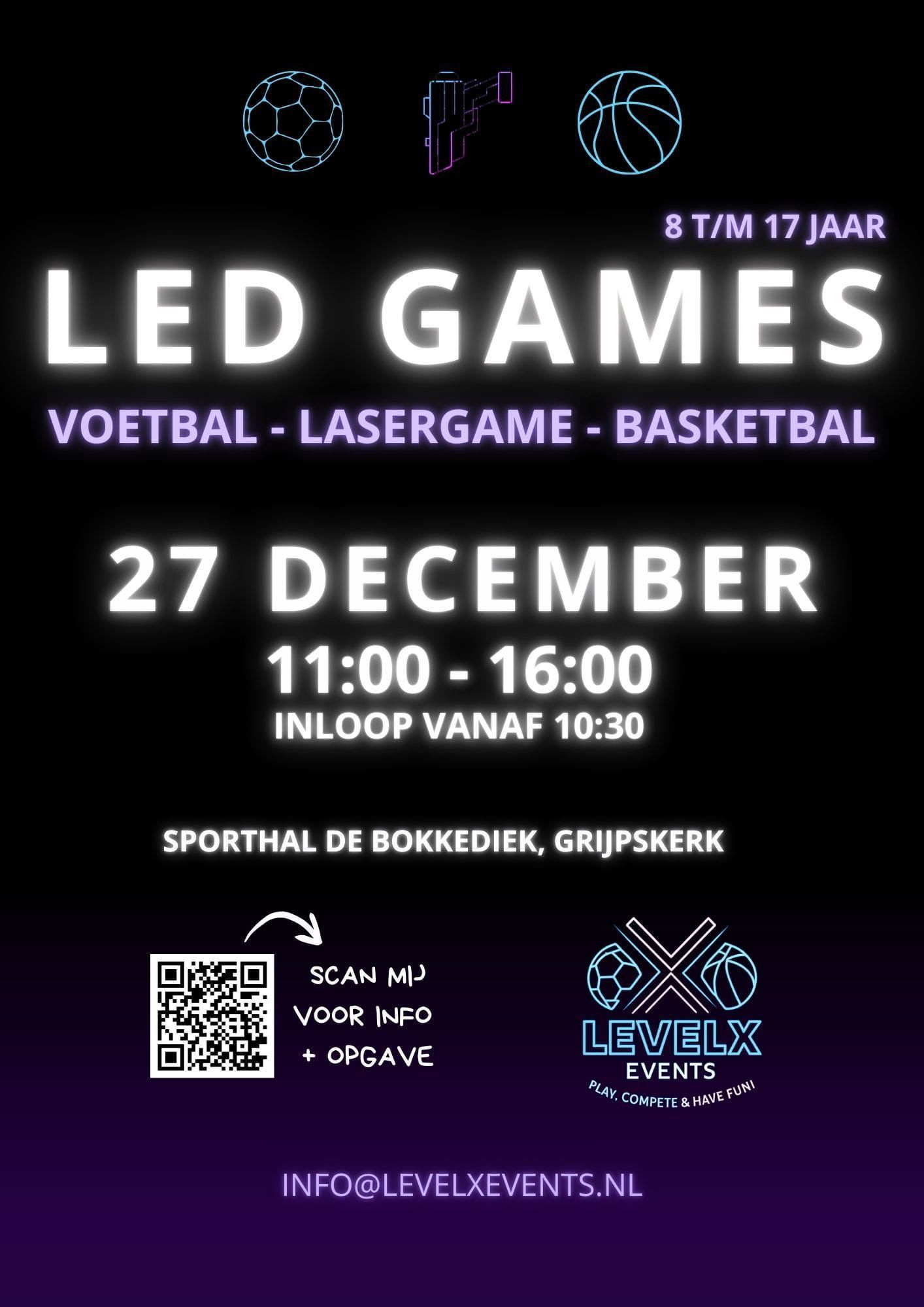 Alle energie kwijt na de Kerst? Kom dan op 27 december naar de LED Games in sporthal de Bokkediek. Enkele inwoners van Grijpskerk organiseren die dag voor kinderen en jongeren een geweldige sportieve dag. Een dag waarbij deelnemers kunnen voetballen, lasergamen én basketballen. Niet zomaar, maar met LED verlichting! En het gaat vooral om samen met elkaar leuke dingen doen. Iedereen is welkom.