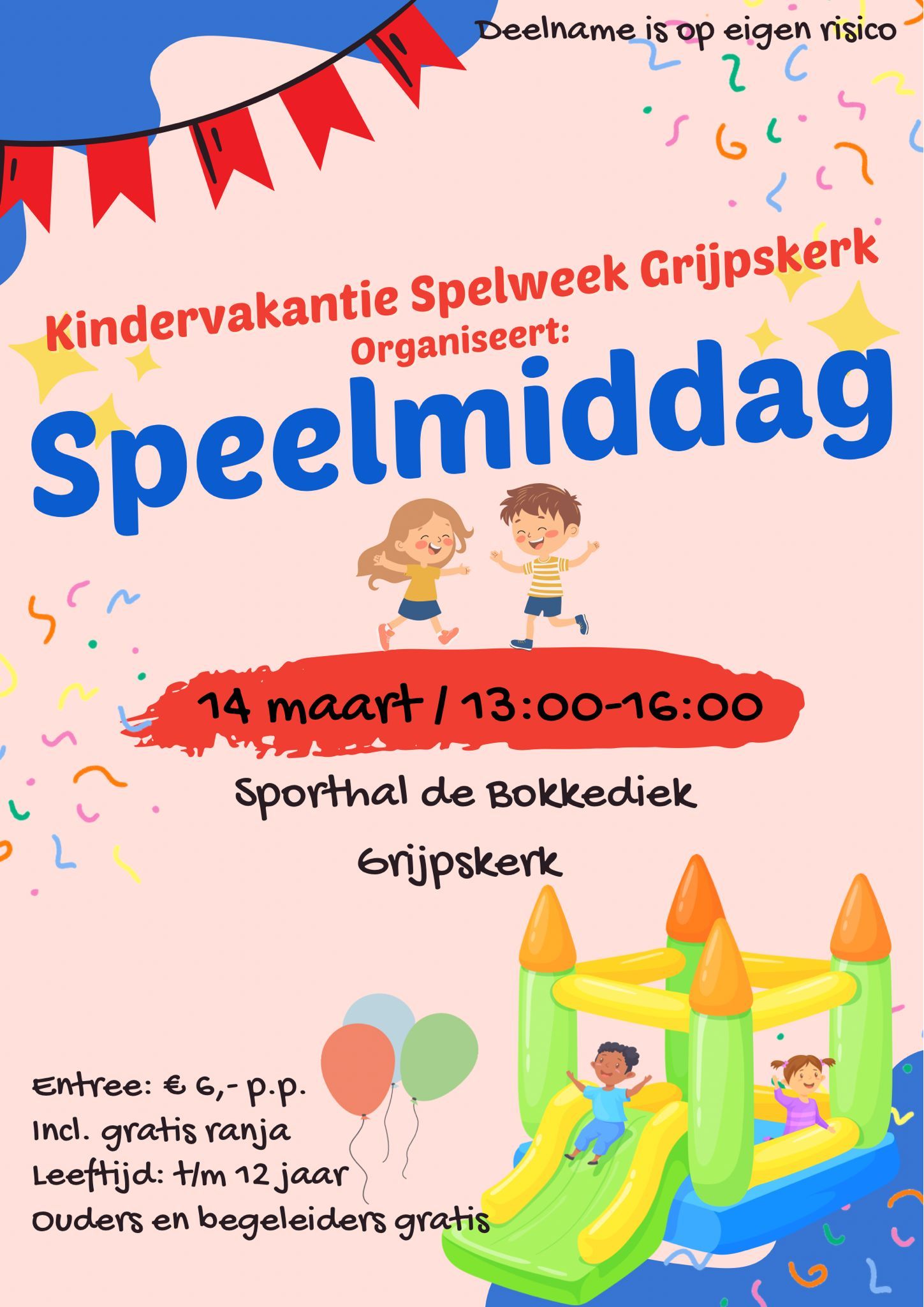 De entree is € 6,- per kind, inclusief gratis ranja. Ouders en begeleiders mogen gratis naar binnen. Meedoen is op eigen risico.