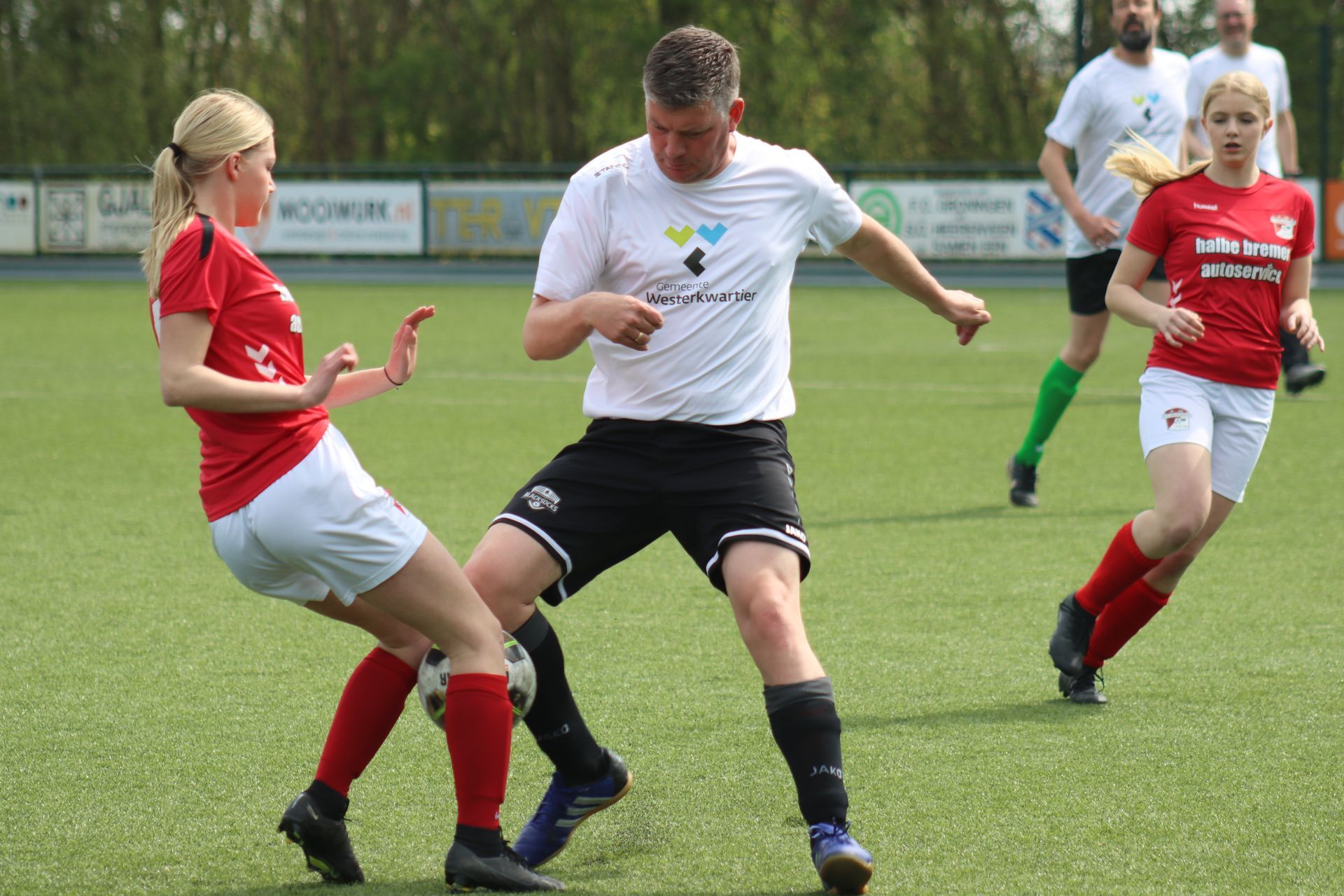 Opening gedaan door wethouder en jongste en oudste spelende leden. Combinatieteam gemeente speelt tegen combinatieteam voetbalvereniging.