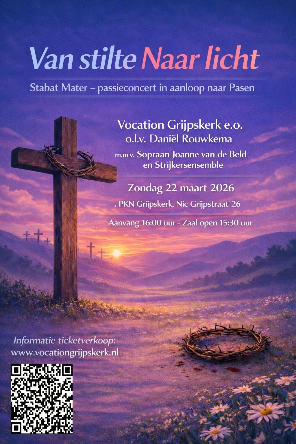 Op zondag 22 maart 2026 brengt Vocation Grijpskerk e.o. het passieconcert Van stilte naar licht in de PKN Grijpskerk. In dit concert, dat plaatsvindt in de aanloop naar Pasen, staat de Stabat Mater centraal: een indringend muziekwerk over lijden, mededogen en hoop.